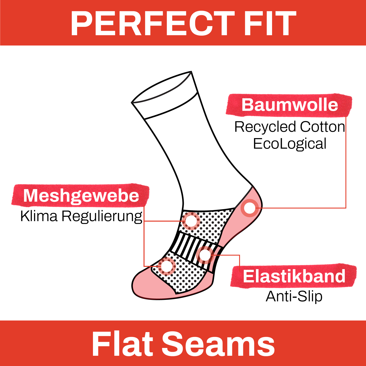 Die Chili Lifestyle Print Socken sind aus hochwertigen Materialien gefertigt, die hohen Tragekomfort und Langlebigkeit garantieren. Die Sohle besteht aus 65% Baumwolle, 32% Polyester und 3% Elasthan, der Schaft aus 100% Polyester. Diese Kombination aus recycelter Baumwolle und Polyester bietet nicht nur einen hohen Tragekomfort, sondern schont auch die Umwelt. Um möglichst kurze Lieferwege und höchste Produktionsstandards zu gewährleisten, werden alle Chili Lifestyle Socken ausschließlich in Europa produziert.